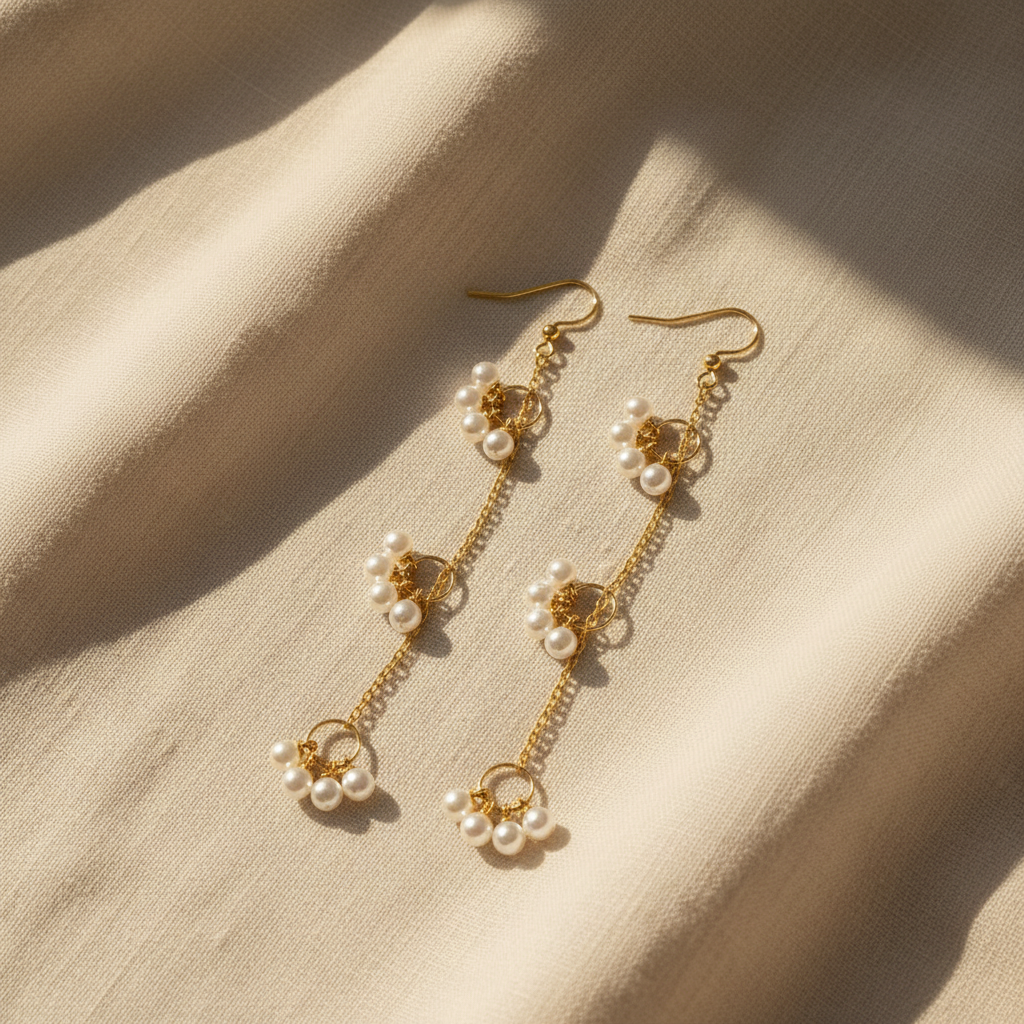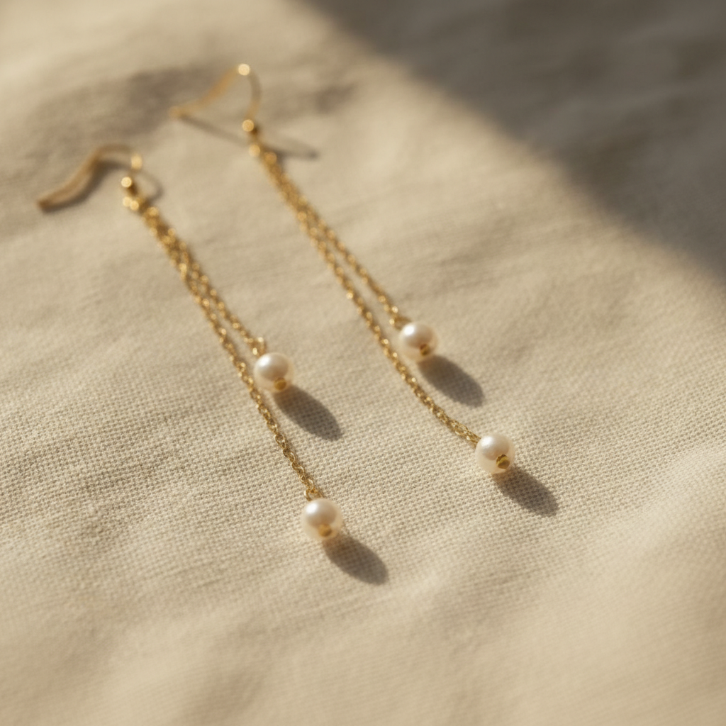 Each pair features real micro pearls suspended from 18K gold-plated stainless steel chain and hardware. The layered drop design creates gentle motion while remaining lightweight and comfortable for extended wear.