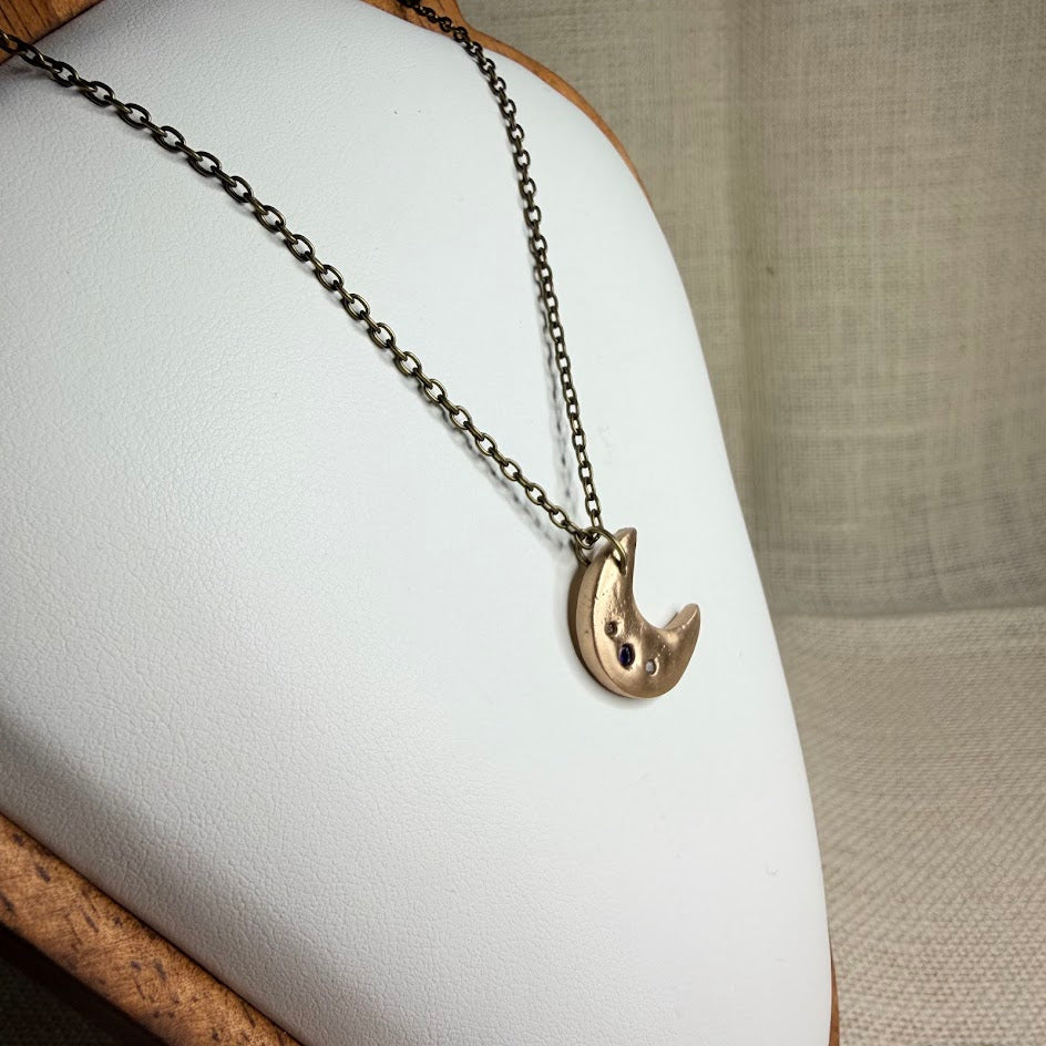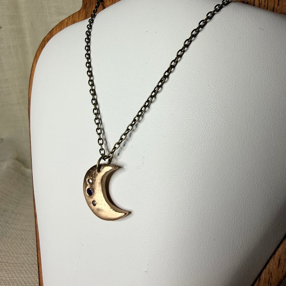 Three stones rest across the face of this crescent — two white, one purple, scattered the way stars scatter, without pattern but not without intention. The Constellation Moon pendant is a quiet piece. The bronze surface holds its warmth and stillness, the stones catching light in small, steady points against it. Celestial without performance.