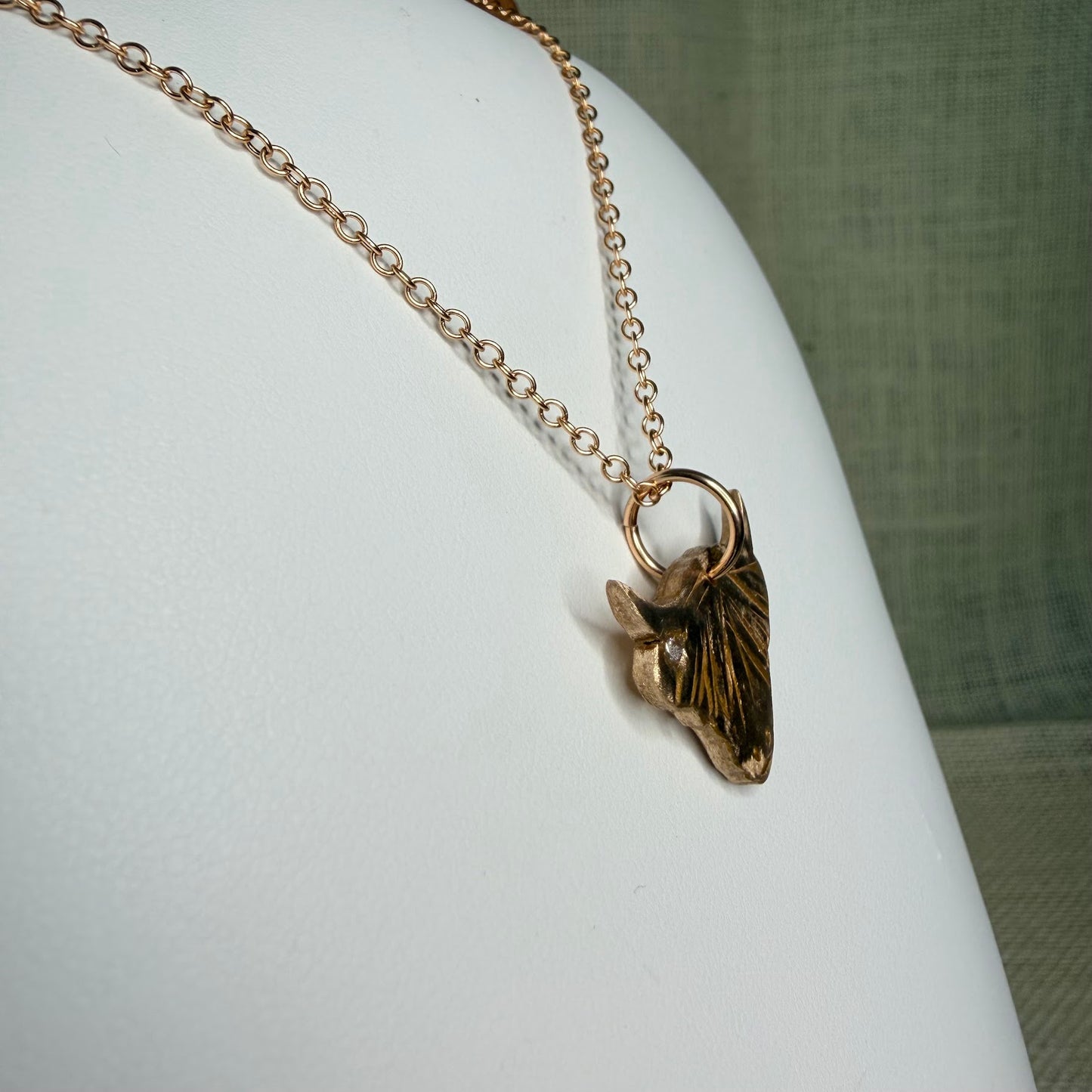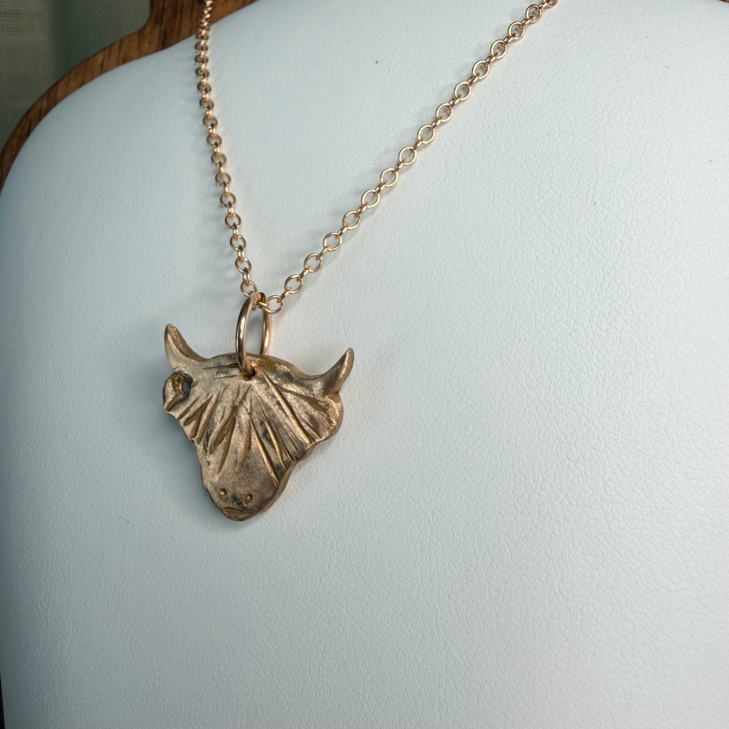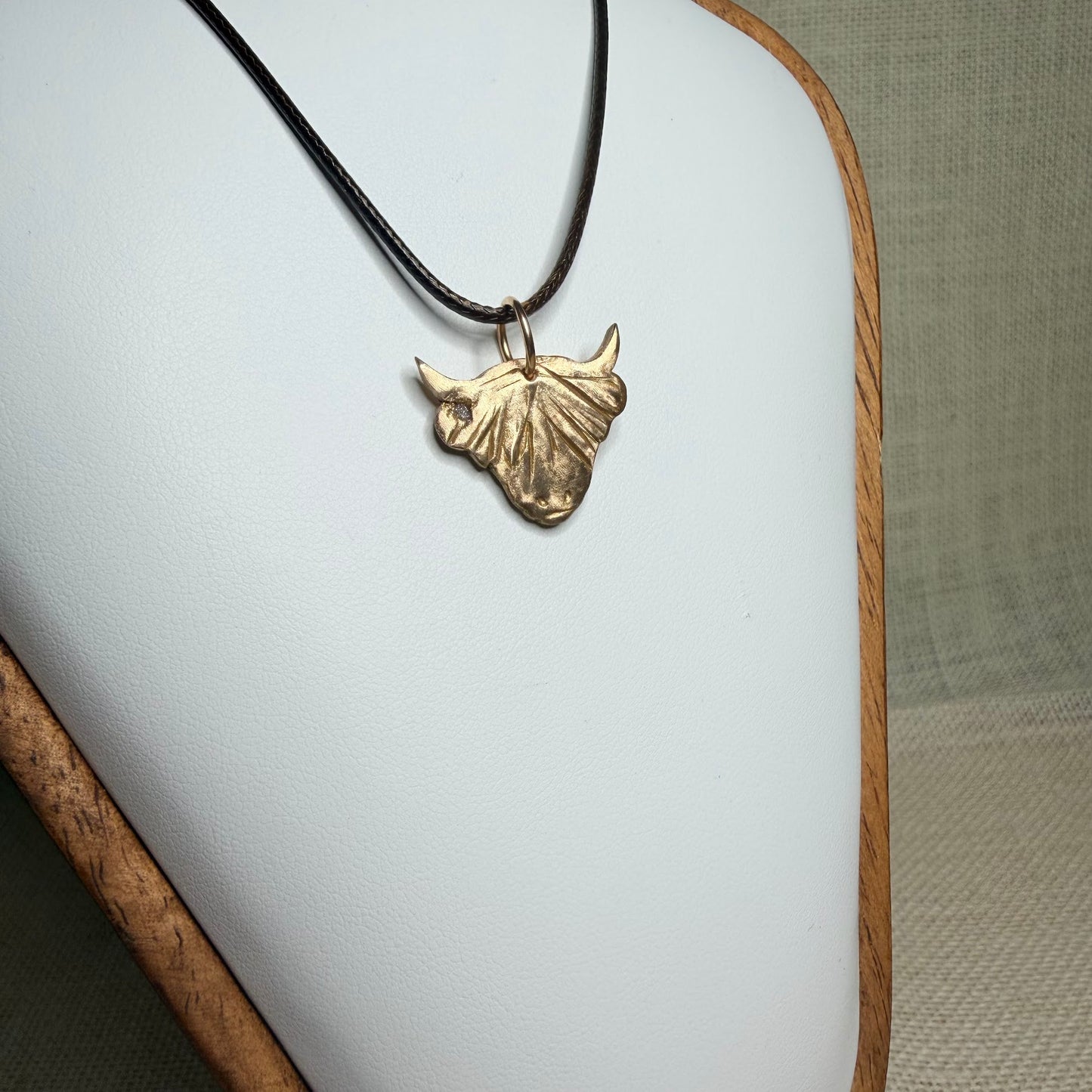 There is something steadfast about a highland cow — unhurried, weather-worn, entirely itself. This pendant captures that quality in bronze. The broad fringe radiates outward from the center of the face in carved lines, the wide horns grounding the silhouette, a small CZ stone set quietly at the ear. It is a portrait rendered with warmth and without sentimentality.