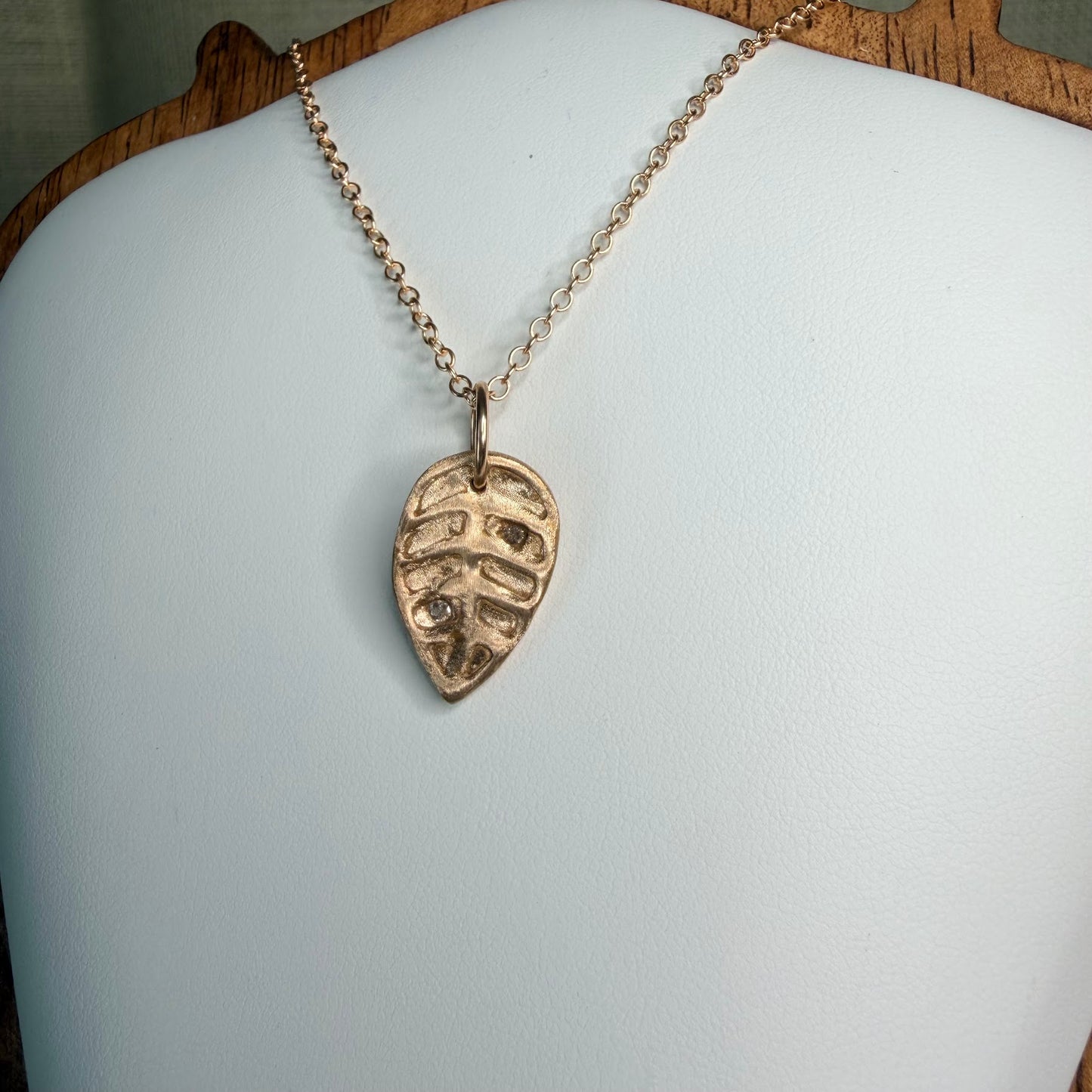Formed from bronze metal clay and fired in a kiln, the pendant carries a warm, matte burnish with depth in the carved lines. The teardrop leaf silhouette is organic and unhurried — slightly irregular at the edges, entirely intentional in form. It hangs from an 18-inch bronze cable chain, 1.8mm, the metal consistent throughout.