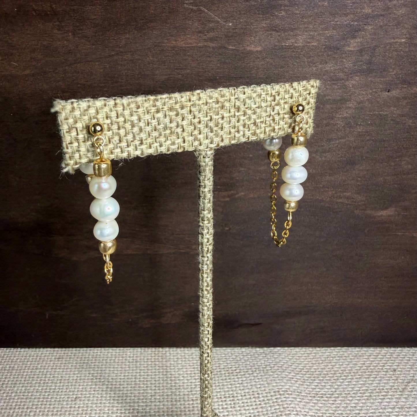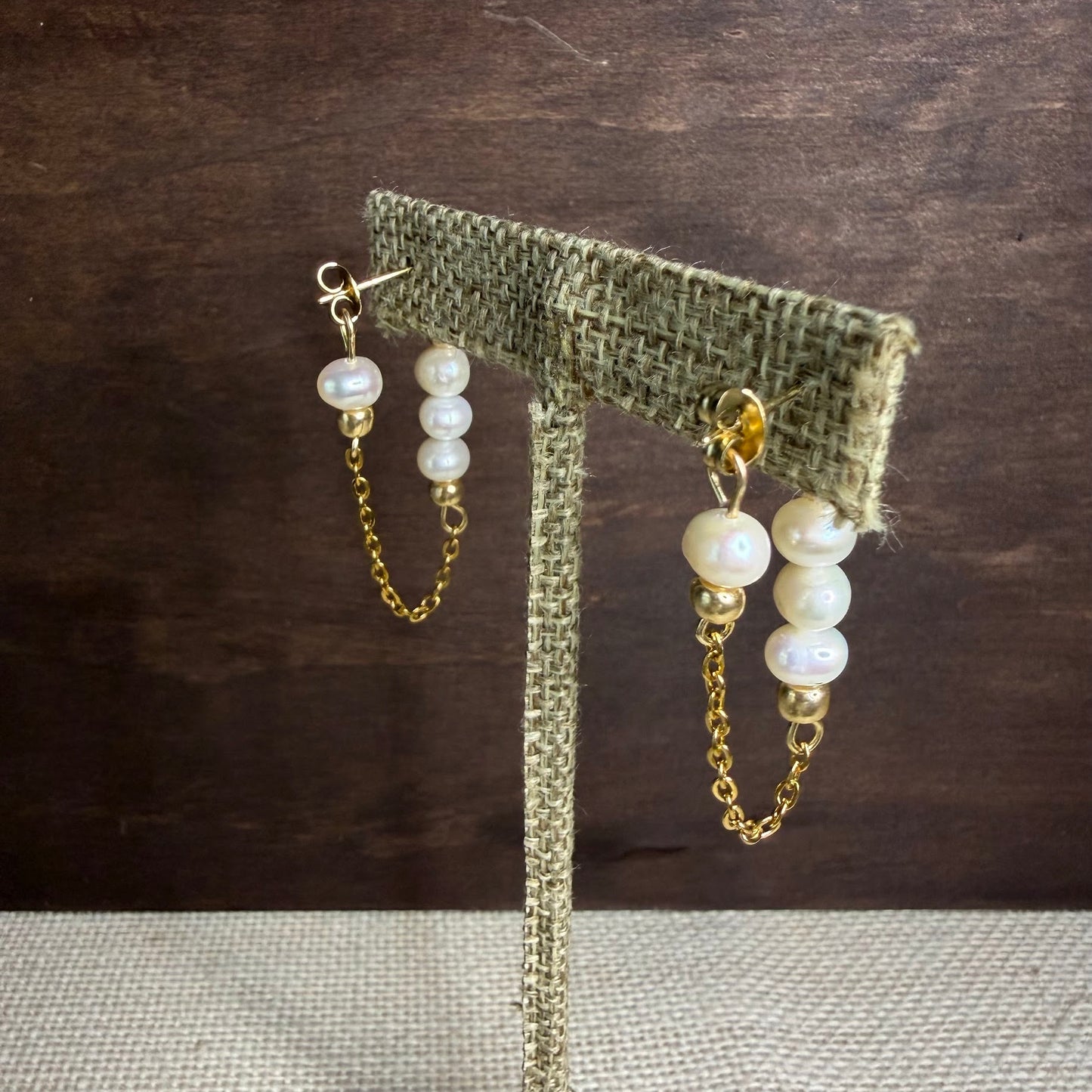 AAA freshwater pearls and gold glass beads strung down a 24K gold plated stainless steel ball stud post, connected by an 18K gold PVD plated cable chain that swags gently below the ear. Quiet to wear, distinctive up close. Handmade in our Georgia studio.
