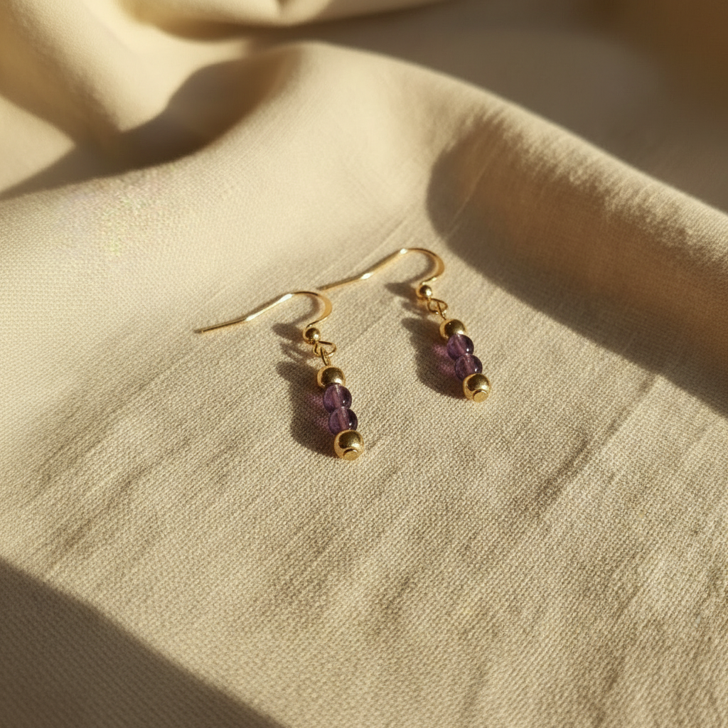 The stacked design forms a small, elegant drop that moves gently as you wear it. The natural translucence of the amethyst catches light softly, adding depth and color while keeping the overall look refined and easy to wear.