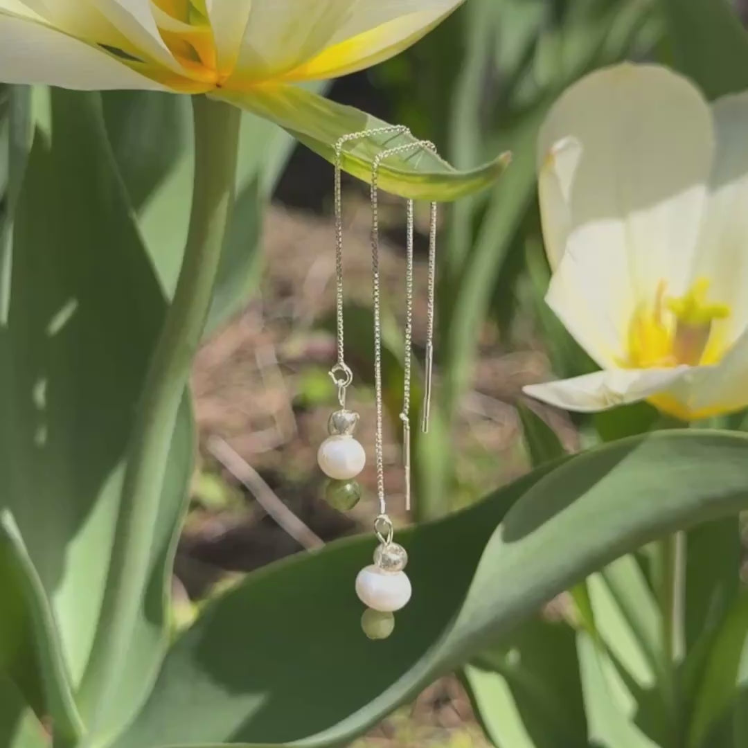 Ivory pearl stacked above moss-green jade, two stones formed by the earth at different speeds. Suspended from a fine sterling silver chain that moves with the body — present, unhurried, and quietly alive.