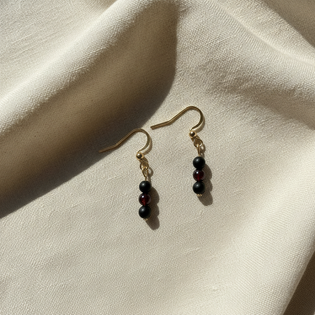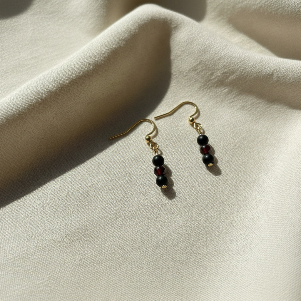 These bead drop earrings combine deep black onyx with rich garnet in a simple stacked design accented by warm gold tones. The contrast between the glossy black stone and the dark red garnet creates a striking yet balanced palette, while the gold accents add a subtle warmth to the piece.