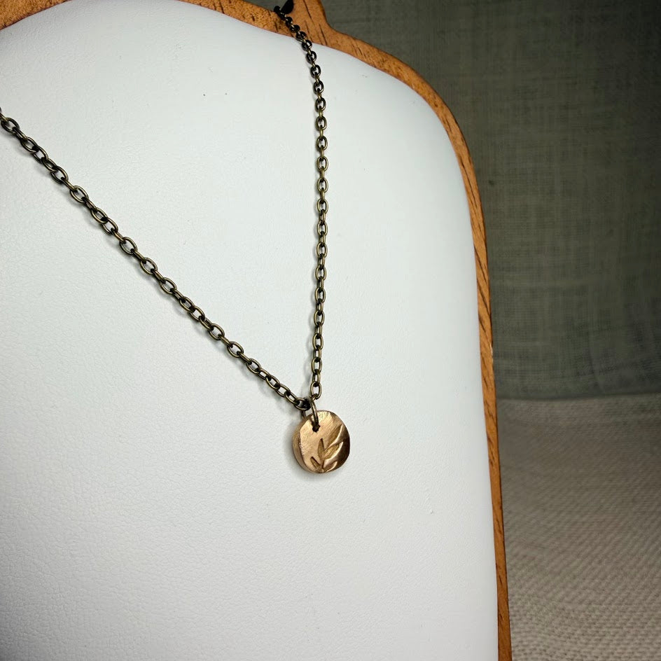 Just under a centimeter across. A single sprig pressed into the face of a small bronze disc, the rest of the surface left open and unhurried. The Small Sprig pendant asks very little — it sits close, moves quietly, and becomes part of the body's rhythm without announcement.