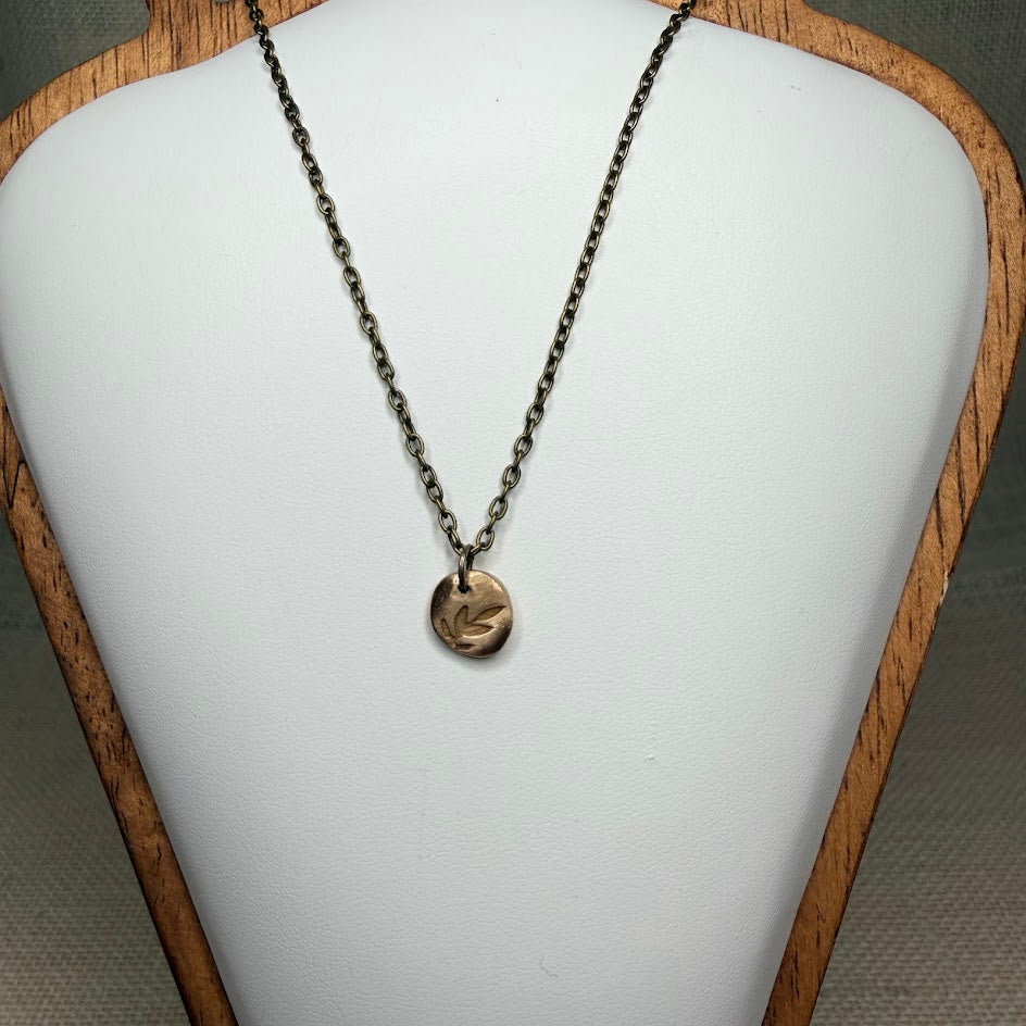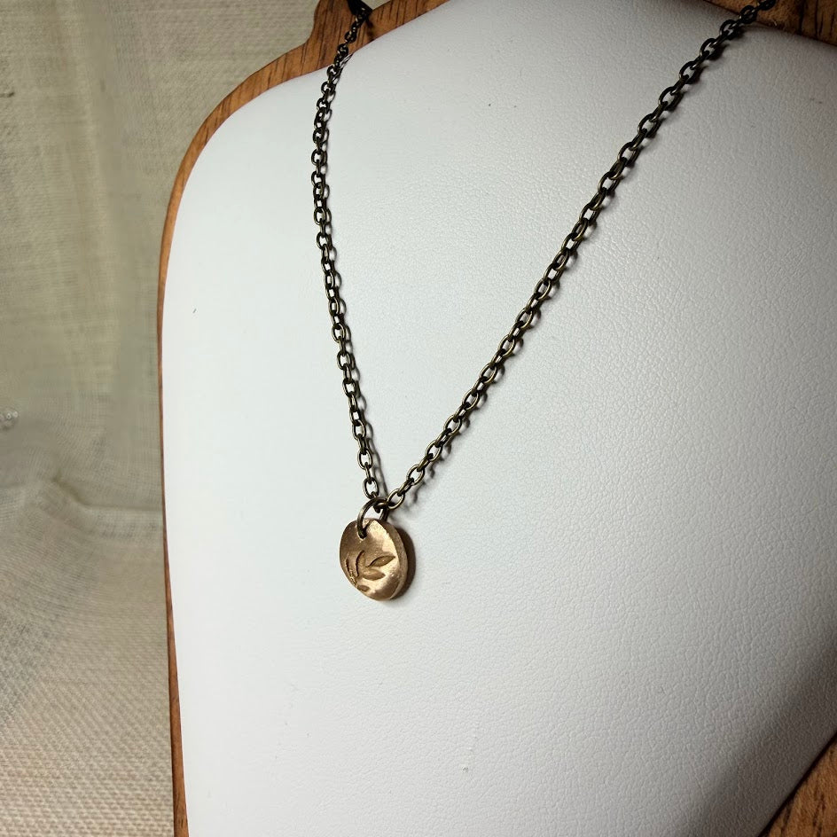 Formed from bronze metal clay and fired in a kiln, the disc is softly irregular at the edges, the botanical impression clear and considered at its center. The bronze warms with wear, the small detail becoming more familiar over time. It hangs from an 18-inch bronze cable chain, 1.8mm, sitting just at the collarbone.