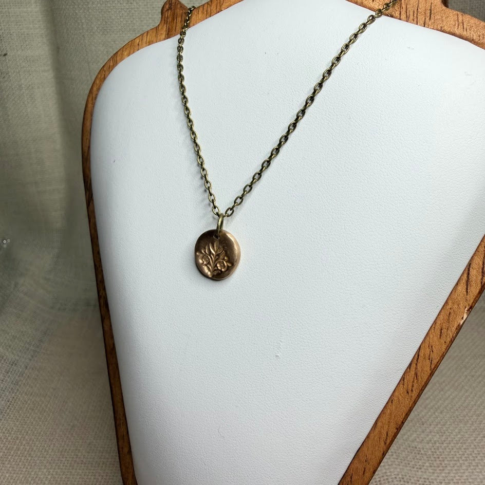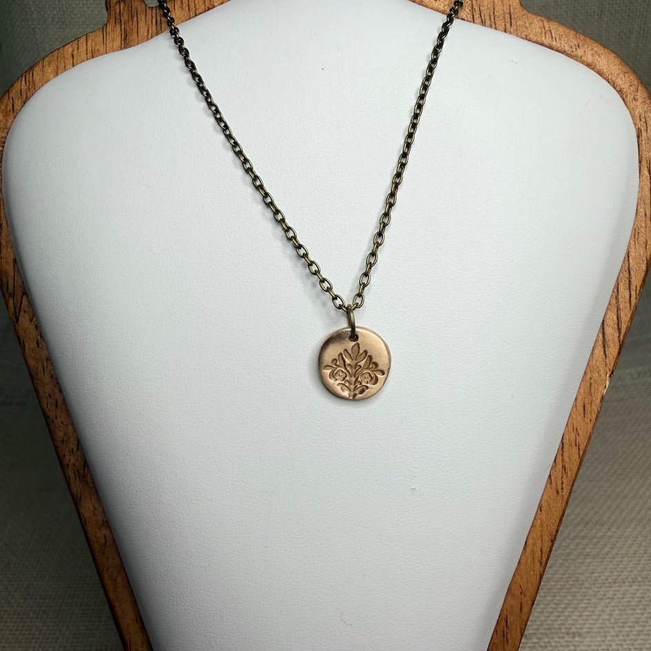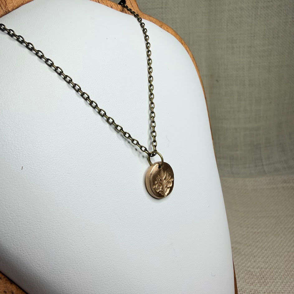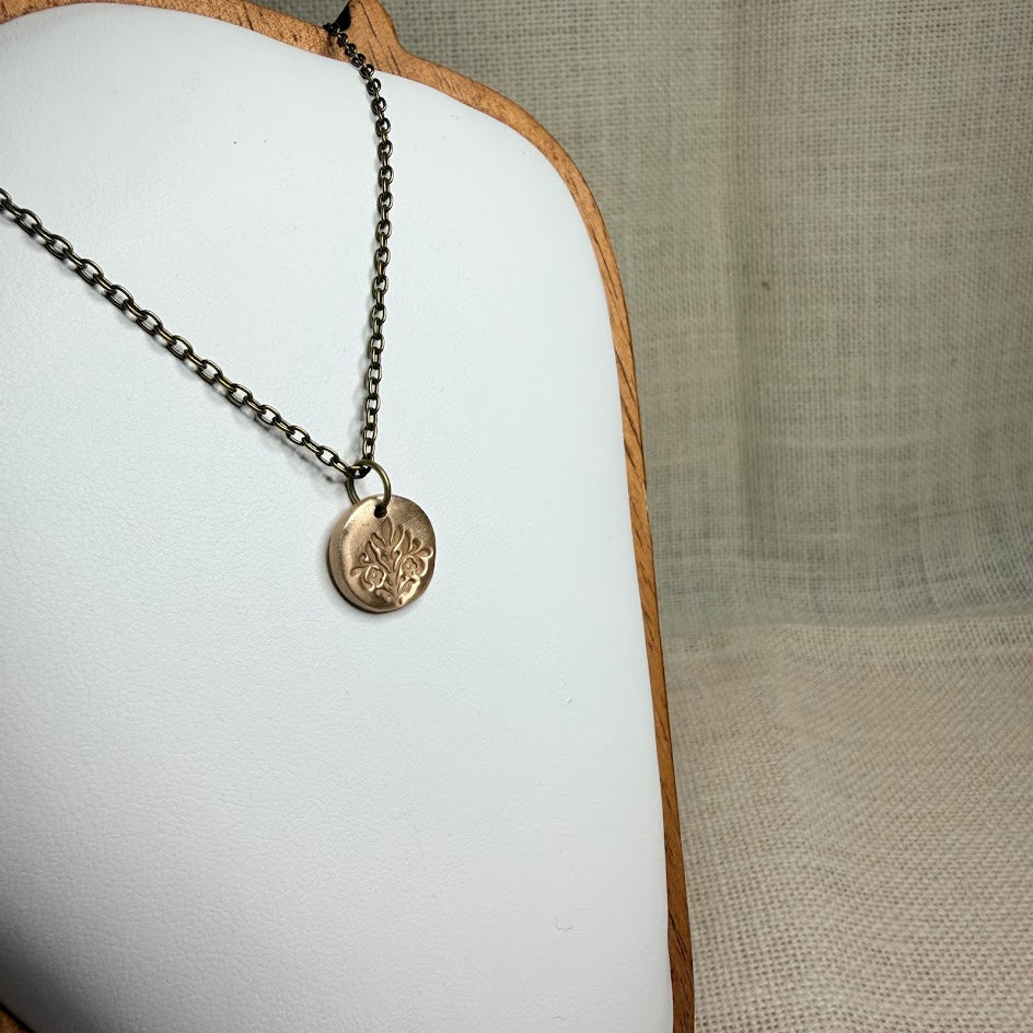 Formed from bronze metal clay and fired in a kiln, the disc is softly rounded at the edges, the botanical motif pressed clearly into the face before firing locks it permanently into the metal. The bronze warms with wear, the detail becoming more familiar over time. It hangs from an 18-inch bronze cable chain, 1.8mm, sitting just at the collarbone.